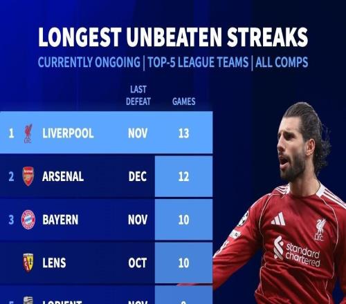 五大联赛球队目前最长不败排行:利物浦13场居首,阿森纳第二