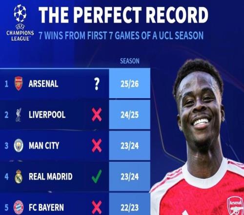 阿森纳是欧冠历史第10支开季7连胜的球队,此前仅2队最终夺冠